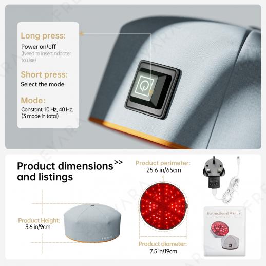 - * 【Smart Features and Easy Operation】With three adjustable pulse modes (no pulse/10Hz/40Hz), this hat adapts to various treatment needs. The one-touch switch and long-press pause function make it simple and convenient to use.
