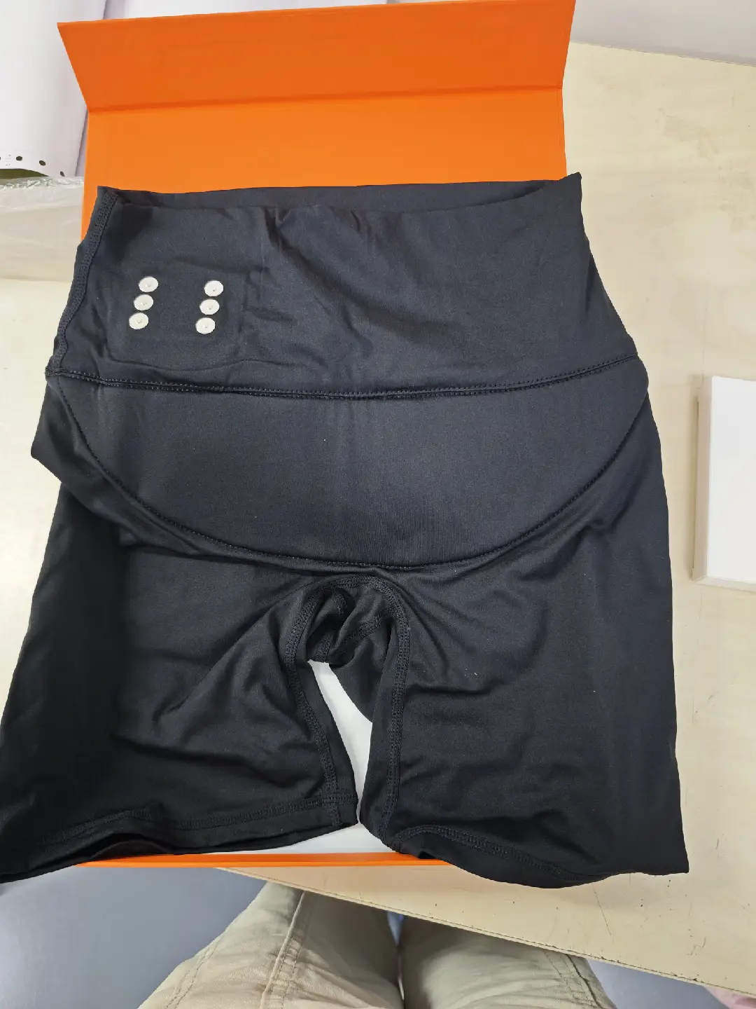 1. After putting on the yoga pants in the correct orientation, attach the main unit to the pants in the correct orientation. Ensure the yoga pants are in close contact with your skin for optimal massage.