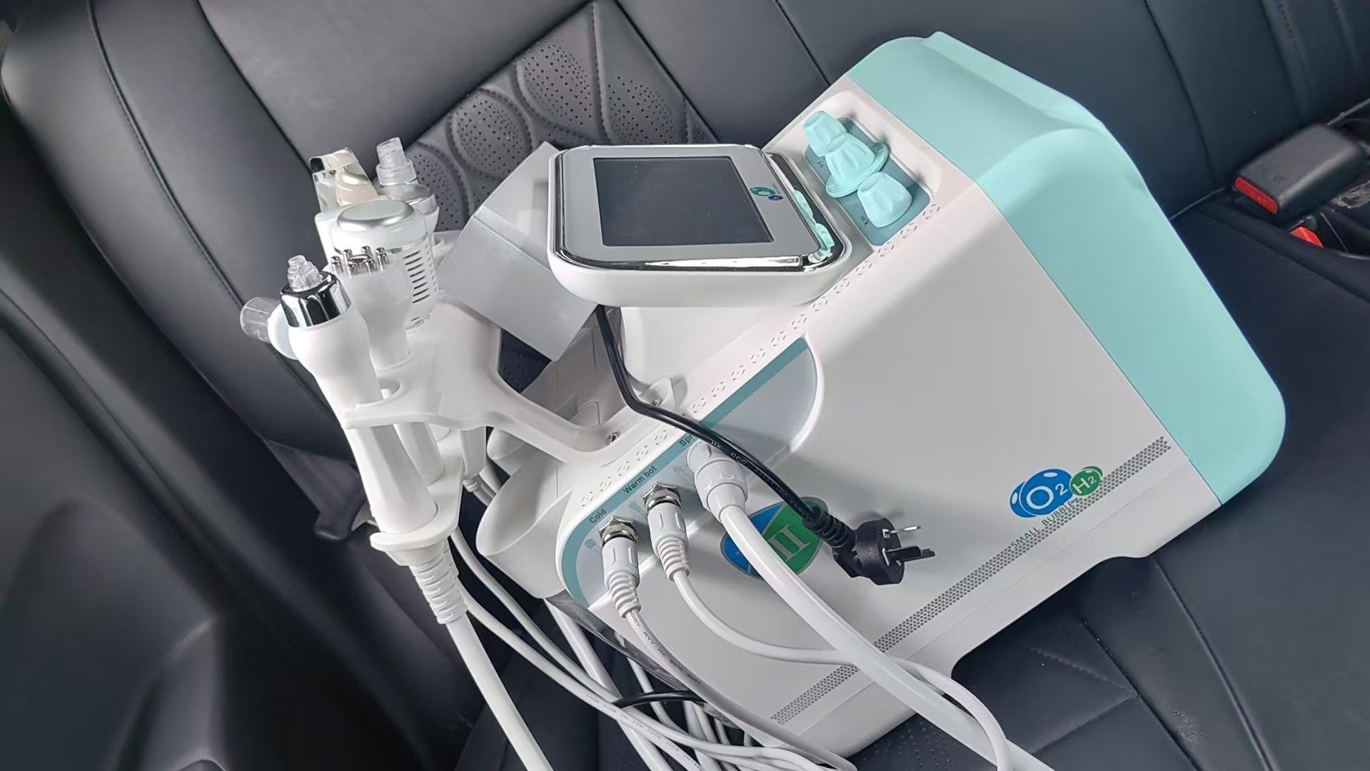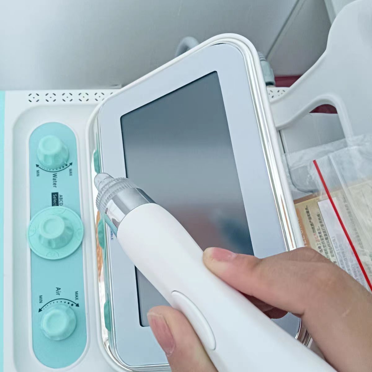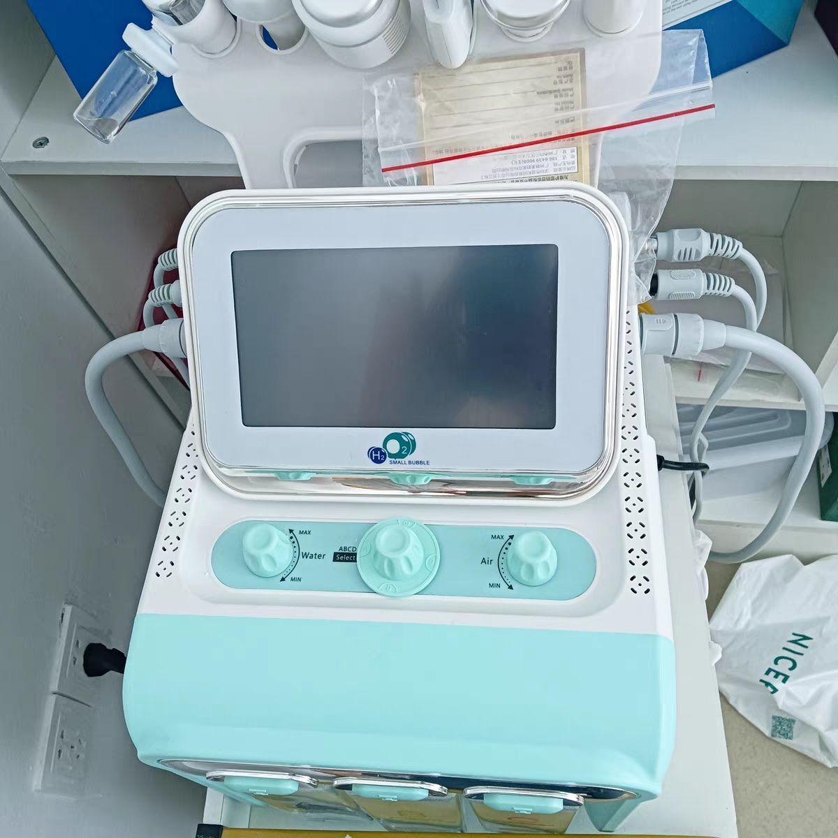 Hydra Pen: select the solution bottle, set the vacuum and water.Press Start on the system, click the corresponding function icon on the screen,and press the button on the handle. If select bottle D for skin clean, turn on H2,O2 function on the system. After treatment, select bottle D, turn off H2/O2 function,use finger to block the handle tips for 2minutes for cleaning handle pipe.