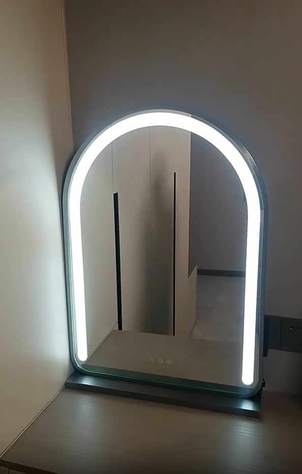 50*70cm Large Arched Vanity Mirror with LED Strip, 360 Rotation, 3 Light Mode Touch, Dimmable Brightness, Plug in to use, Silver Stand